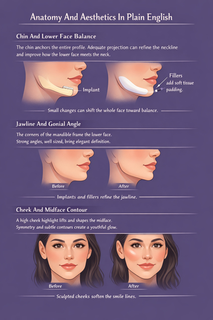 The corners of the mandible shape the lower third of the face. Strong angles can remain feminine when sized to match the midface and lips. Implants sharpen edges and bring clarity to the silhouette. Fillers soften shadows, fill small hollows, and improve transitions without changing the underlying bone. For women who want strength without bulk, careful sizing and placement are the keys to a graceful outline.