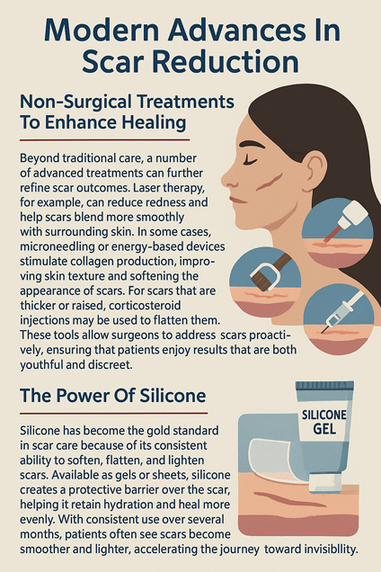 Beyond traditional care, a number of advanced treatments can further refine scar outcomes. Laser therapy, for example, can reduce redness and help scars blend more smoothly with surrounding skin. In some cases, microneedling or energy-based devices stimulate collagen production, improving skin texture and softening the appearance of scars. For scars that are thicker or raised, corticosteroid injections may be used to flatten them. These tools allow surgeons to address scars proactively, ensuring that patients enjoy results that are both youthful and discreet.